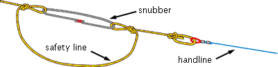 The safety line, made up from a length of 8mm nylon line (or similar) is attached to a cleat or some other strong-point on the boat. Make sure the loop in it is long enough for the snubber to fully extend, but not so long that the snubber can be stressed beyond its yield point.